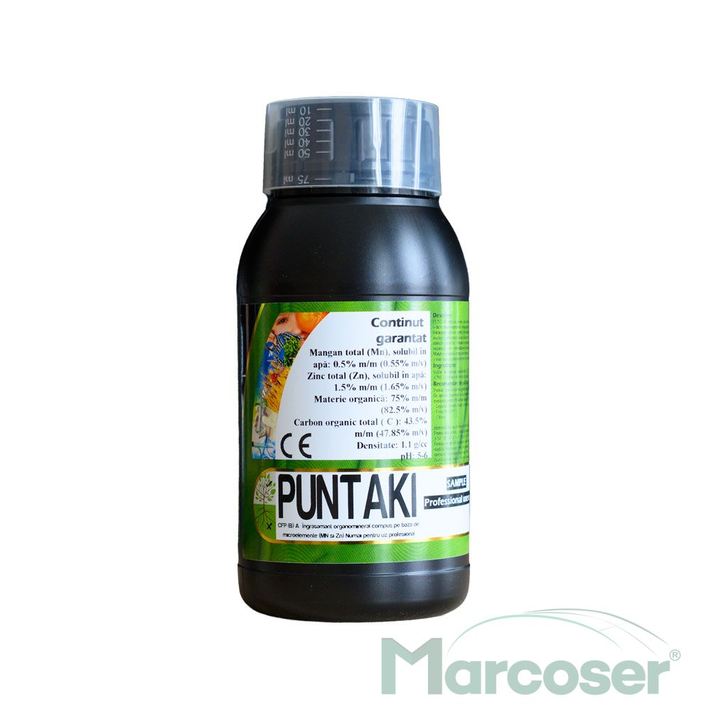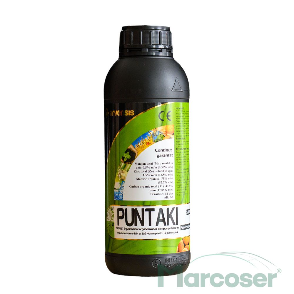 Puntaki este un produs care include elemente esentiale necesare plantelor pentru a asigura o dezvoltare vegetativa corespunzatoare si este recomandat in perioadele de cerinte nutritionale crescute sau pentru corectarea deficientelor de zinc si mangan.