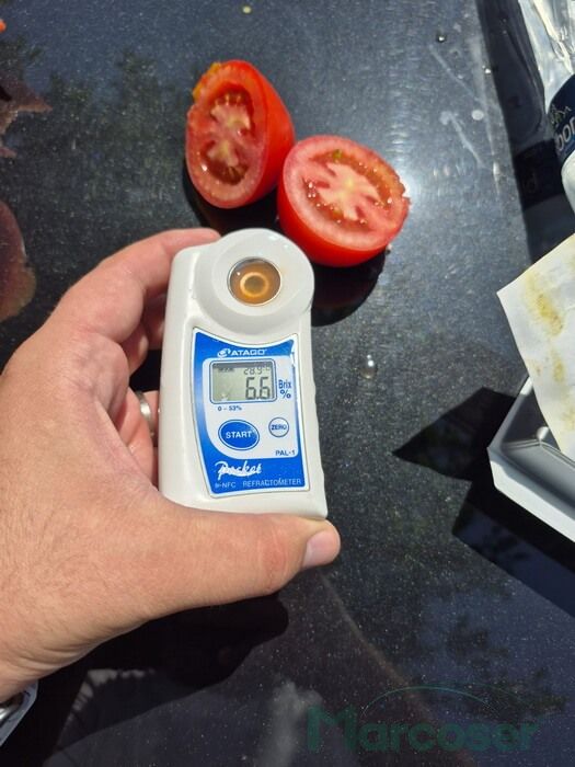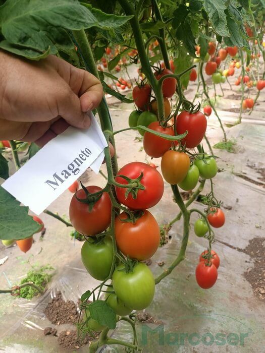 Magneto F1 tomata tip prunisoara, cu fructe mari, de peste 130 g, care leaga constant 7–8 fructe uniforme pe inflorescenta.
